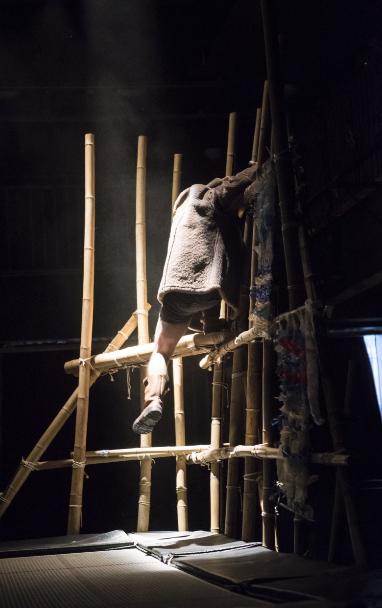 A trampoline, a structure made of bamboo, a freezer… represent a place in nowhere land, a sparse place, a window into the artist mind. Driftwood and objects found on the riverbanks and shores of the country are used to create mask, modes of transportation, costumes and ever changing landscapes.